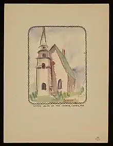 In 1945, Ames wrote a short memoir about Marsden Hartley. Set in the period at the end of his life when he lived in the home of a Maine lobsterman and his wife, it was written as if through the eyes of the wife, Katie Young, a long-term resident whose foreign birth set her apart from the other inhabitants of the tiny village of Corea, Maine. Ames had met Katie and her husband Forrest when she visited Hartley in the chicken-coop studio the Youngs had lent him.[49] After writing it, she kept the typed manuscript among her possessions until 1959 when she donated it to the Smithsonian Archives of American Art. The University of Maine press published the manuscript in 1972 as Marsden Hartley in Maine. The book was edited by Richard S. Sprague, an English professor at the university who was also responsible for acquiring the typescript and arranging for publication. The book had a foreword by the art critic and historian Elizabeth McCausland and an afterword by Carl Sprinchorn, a Swedish-American artist known for paintings made in the North Maine Woods. Ames illustrated the work with line drawings and watercolors. One reviewer said the book was "not really about Hartley at all, though he is certainly a part of the tale. The book is really about friendship, about living and dying, and about how we respond to the death of a loved one.[50] Another reviewer wrote that "Miss Ames's prose is rarely pretentious, and it has always a pleasant flavor of her artist's eye as she sets the scene for Katie's own story. The drawings and watercolors are likewise simple, appropriately reflecting both the homeliness of Hartley's final residence and the sense of absence without him."[51] A watercolor of the church in Correa, shown above at right, is one of the book's illustrations.