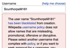 An example of the Scunthorpe problem in Wikipedia because of a regular expression identifying "cunt" in the username