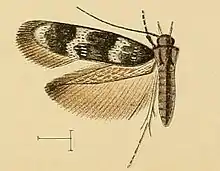 The wingspan is 7โ€“10 mm. The forewings are black, with a few greyish white scales at the base and two greyish white transverse bands. The hindwings are dark leaden grey.[2]