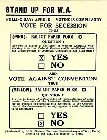Secessionism has been a recurring feature of Western Australia's political landscape since shortly after Federation in 1901.[lower-alpha 1][3] The idea of self-governance or secession has often been discussed through local newspaper articles and editorials.[4][5] On a number of occasions secession has been a serious political issue for the State, including in a successful but unimplemented 1933 state referendum.