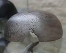 The secrete was usually a small skull-cap of iron or steel pierced around its rim. The piercing allowed it to be sewn into the inside of a hat. The secrete was then undetectable to any observer, but offered considerably more protection from edged weapons than could a felt hat alone. Many different designs were used, some had solid domes, others were ring-shaped with a scalloped lower edge, presumably to save weight. A few exceptional examples had a folding cage of bars, which could be drawn down to afford protection to the face when in action. A further type of head protection which could be considered to fall under the same category, as it was intended to deceive the observer and mimic civilian headgear, was an entire broad-brimmed hat made of iron or steel. Such hat-helmets were either covered in cloth, or blackened and given a dulled finish so as to resemble felt. King Charles I of England is recorded as possessing such a helmet.[3][4]