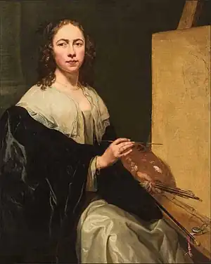 Self-Portrait with Easel is a painting by the Flemish artist Michaelina Wautier. It apparently shows a female artist starting on her painting, having sketched the outline of the head of a portrait. It was painted some time in the 1640s. Despite having been part of various art collections since being completed, it was only identified as being by Wautier in 2013. For a long time, the painting was attributed to the Italian artist Artemisia Gentileschi.[1] Indeed, a 1905 photograph of the painting showed the name Artemisia on the base of the column to the left. It is unknown who added this signature, which is no longer present.[2] A watch with a pink ribbon attached to it sits on the easel, but the precise reason for its inclusion is not known.