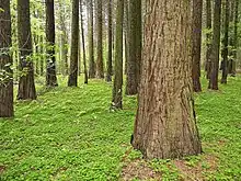 In 1946, Illa Martin and Ernst J. Martin, both dentists and dendrologists in Kaldenkirchen, founded an arboretum close to the Dutch border. There, and in a nearby laboratory-plantation several acres wide from 1952 on, they cultivated 1,500 giant sequoia (Sequoiadendron giganteum) seedlings from seeds of US origin from Martin's nephew Albert A. Martin of Santa Barbara, CA.[1] The seeds were collected in Sequoia National Forest at different elevations, wrapped in burlap to preserve them and sent to Germany. They wanted to find out if the giant sequoia, which had existed in Germany before the ice age, could be introduced to German forestry.[2][3] There was on the one hand an area of purely giant sequoia, on the other an experimental arboretum with trees such as Abies grandis, Abies concolor var. lowiana and Coast Douglas-firs. The project was financially supported by the German Research Foundation and met with great interest from dendrological circles, particularly in Great Britain and in the USA.[4] Part of the field exclusively planted with giant sequoia was reserved for obtaining results of productivity by the "Ecology and Forestry Department" of North Rhine-Westphalia (NRW).[5]