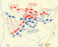 Murad led the Ottoman center, entrusting his younger son Bayezid and his commander Evrenoz with the European troops on the right wing; Murad's other son, Yakub, led the Anatolian troops on the left.[42][43] The wings were fortified with around 1,000 archers, while the Janissaries held the central position, supported by Murad and his cavalry guard standing behind them.[43] Ottoman souces claim that Murat also placed camels in front to scare the Serbian cavalry.[42] One of the Ottoman commanders was Pasha Yiğit Bey.[44]