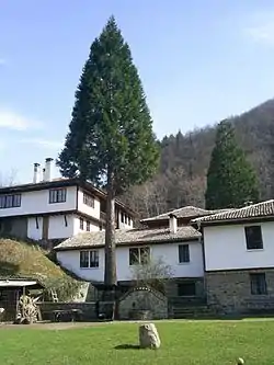 The road to the monastery is quite narrow, but asphalt-paved. The grave of the famous Bulgarian children's writer Zmey Goryanin (1905–1958)—author of 50 books and brochures—is in the yard, behind the church. There are sequoias planted in the monastery yard, the roots of which have started cracking the walls.