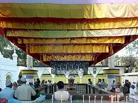 Shah Jalal was a Sufi saint traditionally accredited with the Muslim conquest of Sylhet as well as the propagation of Islam in the region.[3][4] Described by Syed Murtaza Ali as "the patron saint of Sylhet",[5] following his death in 1347, Shah Jalal's burial place in the city became an object of veneration.[6][7] Both Bengali Muslims and Hindus perform pilgrimages to the site to make offerings and prayers to the saint.[8][note 1] The annual urs, a Sufi death anniversary festival, attracts thousands of visitors, mainly from Bangladesh and neighbouring India.[10][11] The Dargah is presently the most visited shrine in Bangladesh,[12] with historian Syed Mahmudul Hasan calling it "the religious centre of Sylhet".[13]