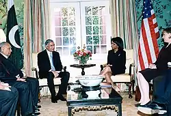 Shaukat Aziz had been a president of Citi Private Bank in New York before returning to Pakistan in 1999.[18] Shortly, General Pervez Musharraf arrived for a small personal trip to the United States after staging a coup d'état to deposed the people-elected prime minister Navaz Sharif on 12 October 1999.[19]