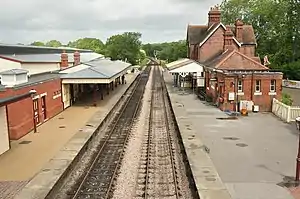 The station also houses the line's locomotive workshops and sheds, which are a major focal point for visitors to the line. It is restored in a LBSCR style of the start of the 20th century. An unusual signal box can be found on the platform, a popular feature being found at other small stations on the LBSCR where cost saving during SR days reduced manning to a Porter/Signalman. The structure of the box is post-preservation, replacing a fence enclosing what was little more than a ground frame. In the longer term[4] a new signal box will be provided to the north of the station, roughly in the same position as the original North signal box, since the current frame is both life expired and too cramped to serve what is now a much busier station than it was ever intended to control.