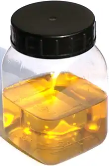 The raw shellac, which contains bark shavings and lac bugs removed during scraping, is placed in canvas tubes (much like long socks) and heated over a fire. This causes the shellac to liquefy, and it seeps out of the canvas, leaving the bark and bugs behind. The thick, sticky shellac is then dried into a flat sheet and broken into flakes, or dried into "buttons" (pucks/cakes), then bagged and sold. The end-user then crushes it into a fine powder and mixes it with ethyl alcohol before use, to dissolve the flakes and make liquid shellac.[11]