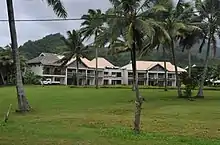 Planning for the resort began in 1987, when the Cook Islands Government was approached by an Italian construction company with a proposal to build a luxury hotel.[3] Without Cabinet approval, Tourism Minister Norman George approved the project and the Cook Islands government subsequently signed a NZ$52 million deal with an Italian bank to fund the development.[1] In 1990, at the sod-turning ceremony, the site of the hotel was "cursed" by a local family due to a dispute over ownership of the land.[2] Shortly after construction began, the construction company was placed in receivership, and its workforce returned to Italy; 16 months later its directors were arrested for fraudulent bankruptcy.[4] The Italian bank chose a second Italian company to complete the project, and construction restated in July 1991.[5] In May 1993, when construction was almost complete, the Italian government withdrew its guarantee for the loan amid rumours of mafia involvement, and construction ceased.[1] The Cook Islands government remained liable for the interest on the loan, and it grew to $120 million, almost bankrupting the country.[2] The resulting government austerity was a major driver in a wave of emigration to New Zealand.[2]