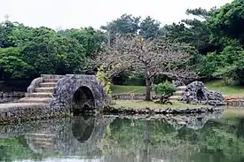 The stroll garden features a pond with two small islands; a Chinese-style hexagonal pavilion; other pavilions with red tiles, the use of which was reserved for the upper classes; Chinese-style arched bridges; and seasonal plantings of plum, wisteria, and bellflower.[2][3] This blend of Japanese and Chinese design and features has been acclaimed as "uniquely Ryukyuan" by UNESCO and advisory body ICOMOS.[3][4]