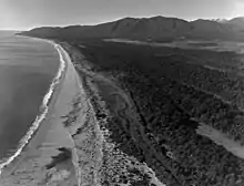 Ship Creek is at the northern end of the Haast plain that extends 50 km (31 mi) to Jackson Bay / Okahu. The plain has an unusual landform, with long parallel lines of low hills with narrow swales in between. In some places, the plain is 10 km (6.2 mi) wide, with six rows of dunes and swales. The landform results from the combined effects of sediment carried to the coast by six large rivers, longshore drift and periodic seismic uplifts. The rivers discharging into the Tasman sea in this region of coastline drain from large catchment areas in the Southern Alps, where there is high rainfall and the mountains have high rates of erosion.[9] The suspended sediment yield of the Arawhata River has been reported as 7.18 Mt/yr, and the Haast River as 5.93 Mt/yr. The total estimated suspended sediment yield from rivers in South Westland is over 50 Mt/yr.[10] Longshore drift leads to much of this sediment being deposited along the Haast coastline, forming dunes. The Alpine Fault runs along the inland edge of the plain, and the entire area is subject to tectonic uplift during major seismic events. Following a major uplift, existing dunes are no longer exposed to the action of the sea, and new dunes begin to form. This creates a longitudinal pattern of dunes with low-lying wetlands in between. The coastal plain is approximately 6,000 years old. The dunes close to the current shoreline have little vegetation, but the older dunes further inland are forested with tall podocarps. The swales contain wetland lakes, pakihi and kahikitea swamp forest.[9]