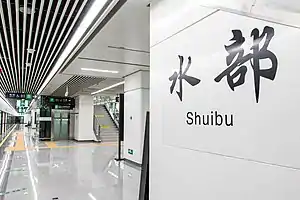 Shuibu Station (Chinese: 水部站; pinyin: Shuǐbù zhàn; Fuzhounese: [t͡sui˥˥ βuɔ˨˦˨]) is a metro station of Line 2 of the Fuzhou Metro. It is located near the intersection of Gutian Road and Jianhua Branch Lane, Gulou District, Fuzhou, Fujian, China. It started operation on April 26, 2019.[1]