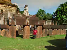 Wat Chedi Chet Thaeo (Thai: วัดเจดีย์เจ็ดแถว) means the temple of seven rows of stupa. The temple is one of the most important historic sites inside the town wall of Si Satchanalai. The temple is located in front of Wat Chang Lom and is considered unique among the temples in Sukhothai Kingdom, because it consists of 32 stupas of different sizes in different styles. The gigantic size of the temple in the town center indicates that this temple was built for the royal family. Vajiravudh wrote in his Phra Ruang City Journey that a local claimed that the temple was once called Wat Kalayanimit and was built by a daughter of Lithai. Damrong Rajanubhab believed that the temple was the burial place for the ruling family of Si Satchanalai. Pattern of Stupas at Wat Chedi Chet Thaeo are influenced by various artistic styles such as Sri Lanka, Lanna and Bagan stupa which has unique square tower base with a spherical top and arched hall façade stucco for standing Buddha image in beautiful Sukhothai style. Inside the temple, there were vihara, ordination hall, five mandapas and a sacred pond. There was also a defensive wall around the temple which was originally surrounded by a moat.