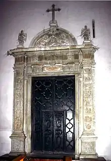 Little by little Renaissance classical elements were absorbed into Sicilian architecture, mainly coalescing episodically as in Syracuse Cathedral's sacristy or in small buildings such as the chapels added to churches.[10] Those chapels included the Naselli chapel at San Francesco in Comiso, the Confrati chapel at Santa Maria di Betlem in Modica, the 'Dormito Virginis' chapel at Santa Maria delle Scale in Ragusa, the Marinai chapel at Annunziata church in Trapani (designed by Gabriele di Battista[11]).