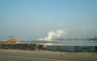At its peak it spewed up to 180,000 cubic metres (6,400,000 cu ft; 240,000 cu yd) of mud per day.[4] By mid August 2011, mud was being discharged at a rate of 10,000 cubic meters (13,000 cu yd) per day, with 15 bubbles around its gushing point. This was a significant decline from the previous year, when mud was being discharged at a rate of 100,000 cubic meters (130,000 cu yd) per day with 320 bubbles around its gushing point.[5] It is expected that the flow will continue for the next 25 to 30 years.[4][6] Although the Sidoarjo mud flow has been contained by levees since November 2008, resultant floodings regularly disrupt local highways and villages, and further breakouts of mud are still possible.[7]