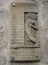 The local prison was one of the most important German prisons in the Reichsgau Wartheland.[10] Its prisoners, predominantly Poles and Jews, were subjected to insults, beatings, forced labour, tortures and executions.[11] Prisoners were given very low food rations, and meals were even prepared from rotten vegetables, spoiled fish and dead dogs.[12] Many prisoners died of exhaustion, starvation or torture.[12] After the war, Polish historian Antoni Galiński was able to identify 968 people who died or were shot in the prison and its subcamps in 1940–1945, however the overall number of deaths is certainly higher.[13] Despite such circumstances, the Polish resistance movement still operated in the area. The last executed prisoner was Antonina Chrystkowa, a female member of the Home Army resistance organization, who was beheaded with an axe on 18 January 1945.[14] Another German prison was operated in the present-day district of Chabie; it was subordinate to the main prison in Sieradz.[15]