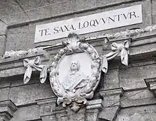 At the tunnel entrance on the old town side an inscription was carved over a bas-relief of the Prince-Archbishop with the words Te saxa loquuntur ('The stones will speak of you'). Originally the structure of the baroque horsepond with its frescoes extended in front of the current eastern gate, giving the square a symmetrical form. A decorative gate within that structure led under cover to the present gate at the head of the tunnel. This structure was demolished around 1860.[9]
