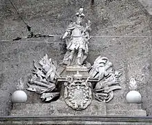 The western entrance on the Riedenburg side has a statue of the martyr Sigismund of Burgundy (†524) above war trophies and the Schrattenbach crest.[6] The inscription there reads: 'D(eo) O(ptimo) M(aximo) - D(ivino) Sigismundo M(artyri) publico bono, commodo decori. SIgIsMVnDI ArChIepIsCopI SaLzVrgensIs P(rincepis) S(acri) R(omani imperii) comitib(us) de Schrattenbach aeternae memoriae W(olfgangus) Hagenauer archit(ectus)'. The capital letters in the inscription, added together, come to 1767. The plinth of the statue carries the inscription Joan(nnae) Hagenauer inv(enit) exc(ussit) et eff(ecit) ('Johann (Baptist) Hagenauer discovered, hewed it out and completed (this statue)').