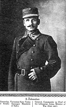 In early 1919, as Chief of the General Staff of the newly created Lithuanian Army, he pushed the invading Soviet forces out of Lithuania by the end of August 1919 with a successful offensive. However, he was dismissed from command as the organizers of the Polish coup d'état attempt planned to make him a military dictator. Although Žukauskas was likely unaware of this plot, he was known as a Polish sympathizer,[1] speaking Polish,[2] and generally faced resistance from younger Lithuanian officers. These tensions forced him out of the command twice more, but he was brought back in February 1920 after communist-inspired soldier's mutiny in Kaunas and in October 1920 following the Lithuanian defeat in the Battle of Sejny. He commanded Lithuanian forces fighting against Żeligowski's Mutiny in Autumn 1920. He is reputed as a key figure in the Lithuanian Wars of Independence.[3] He resigned from active military duty in June 1921, being brought back from retirement in June 1923 as the Lithuanian Army's commander until January 1928.