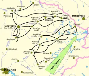On 7 May, Žukauskas assumed command of the entire Lithuanian Army and initiated a complete reorganization of the Lithuanian forces into two groups.[23] The first brigade, stationed in Ukmergė, was known as the Vilkmergė Group and was ordered to push along the Utena–Zarasai line.[20] The second brigade, was known as the Panevėžys Group, was charged with capturing Panevėžys and then pushing along the Kupiškis–Rokiškis–Obeliai line.[20] On 18 May, the reorganized army carried out its first operation and captured Kurkliai and Anykščiai.[24] The army successfully pushed forward and captured one town after another. By mid-June, Lithuanians had the Soviets cornered in a small region around Zarasai. After more than a month of the relatively stable front, the Lithuanians attacked on 23–29 August and pushed the Soviets across the Daugava River.[25] On 28–29 June, Žukauskas distributed the first military awards, then merely a ribbon, which later became the Cross of Vytis.[26]