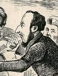 A sketch of Simeon Jacobs (centre), between Prime Minister Molteno (in his sunglasses) and Commissioner Charles Brownlee (in the background). From a set of caricatures of the Molteno government by the Lantern newspaper. 1877-1878
