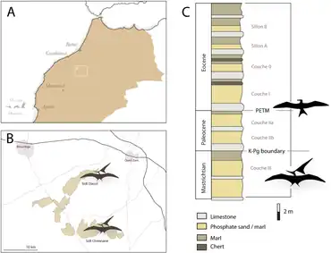 1. 1 2 3 4 5 6 7 Longrich, Nicholas R.; Martill, David M.; Andres, Brian; Penny, David (2018). "Late Maastrichtian pterosaurs from North Africa and mass extinction of Pterosauria at the Cretaceous-Paleogene boundary". PLOS Biology. 16 (3): e2001663. doi:10.1371/journal.pbio.2001663. PMC 5849296. PMID 29534059.