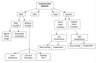 Basic crystal growth methods can be separated into four categories based on what they are artificially grown from: melt, solid, vapor, and solution.[2] Specific techniques to produce large single crystals (aka boules) include the Czochralski process (CZ), Floating zone (or Zone Movement), and the Bridgman technique. Dr. Teal and Dr. Little of Bell Telephone Laboratories were the first to use the Czochralski method to create Ge and Si single crystals.[8] Other methods of crystallization may be used, depending on the physical properties of the substance, including hydrothermal synthesis, sublimation, or simply solvent-based crystallization.[9] For example, a modified Kyropoulos method can be used to grow high quality 300 kg sapphire single crystals.[10] The Verneuil method, also called the flame-fusion method, was used in the early 1900s to make rubies before CZ.[7] The diagram on the right illustrates most of the conventional methods. There have been new breakthroughs such as chemical vapor depositions (CVD) along with different variations and tweaks to the existing methods. These are not shown in the diagram.