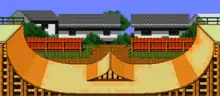 Double Trouble is a large half-pipe with a smaller spine ramp in the middle. Unlike the half-pipe in the first Skate or Die! game, Double Trouble is two screens instead of one. The player has three minutes to perform his tricks. If he wipes out three times the game is over (although there is a code a player can enter to attain unlimited boards). Should the player go on a scoring streak CJ appears in a window of a house in the background, doubling the number of points the player receives with each trick for a short amount of time.