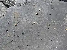 Slate is a fine-grained, metamorphic rock that shows no obvious compositional layering, but can easily be split into thin slabs and plates.[2][3] It is usually formed by low-grade regional metamorphism of mudrock.[4][5] This mild degree of metamorphism produces a rock in which the individual mineral crystals remain microscopic in size,[5] producing a characteristic slaty cleavage in which fresh cleavage surfaces appear dull. This is in contrast to the silky cleaved surfaces of phyllite, which is the next-higher grade of metamorphic rock derived from mudstone.[6] The direction of cleavage is independent of any sedimentary structures in the original mudrock, reflecting instead the direction of regional compression.[7]