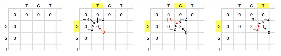Initialize and fill the scoring matrix, shown as below. This figure shows the scoring process of the first three elements. The yellow color indicates the bases that are being considered. The red color indicates the highest possible score for the cell being scored.