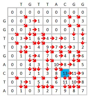 Take the alignment of DNA sequences TGTTACGG and GGTTGACTA as an example. Use the following scheme:
