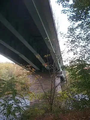 The previous structure on this site was a cantilever bridge built in 1900 to connect Smithton, which was then thriving due to its brewery, with residences on the west bank of the river; a state court ruled in favor of petitioners who demanded the creation of a bridge, but ordered that they contribute $1,200 in construction costs.[1] Until the completion of the Smithton High-Level Bridge in 1956 (which eventually became part of busy Interstate 70), this structure was one of the most important vehicular crossings of the river. In 1986, the original bridge was replaced by a modern girder bridge.