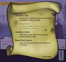 The designers noted during playtesting that there were alternative solutions to some of their puzzles. For instance, in the first round, the salesman comically argues that "deer steal our jobs", which the player is meant to counteract by asking for backing. Some players, however, presented the idea that "Deer live in the woods", arguing that they could not steal human jobs due to their location. The designers said this was a valid move and wrote into the game a customized response to it.[3][4] One important game mechanic is the ad hominem attack "Your face is ugly", which always fails in-game and was designed to teach players that this type of argument is unhelpful and flawed.[5] The game was designed to be more flexible and interactive than a book or film presentation of such philosophical debates.[5]