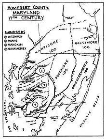 Somerset County was settled and established by English colonists in part due to a response to the Province/Dominion of Virginia passing a law in 1659/1660 requiring Quakers in the colony to convert to Anglicanism or leave the colony. A group of Virginia Quakers living in Accomack County, Virginia, on the southern tip of what later became known as the Delmarva Peninsula, petitioned Charles Calvert, third Lord Baltimore in 1661 to migrate to the Eastern Shore of Maryland to the territory under his governance. The governor considered this an opportunity to fortify the borders of his territory on the Delmarva Peninsula against the pressing encroachment of the Virginians.[3]