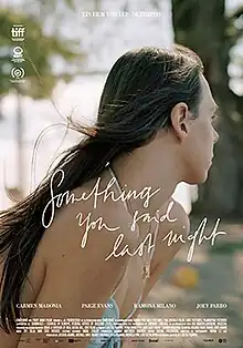 Something You Said Last Night is a 2022 Canadian-Swiss[1] drama film, written and directed by Luis De Filippis.[2] The films stars Carmen Madonia as Ren, a young transgender woman in her mid 20s who accompanies her family on a vacation, during which she is torn between her desire to establish her independence and the comfort of retreating back into being taken care of by other people.[1]