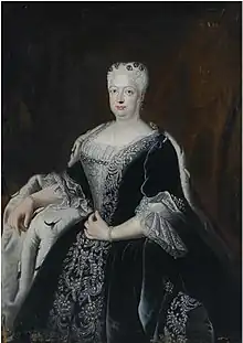 Queen Sophia Dorothea was admired for her gracious manners and nicknamed "Olympia" for her regal bearing, but scarred by smallpox and overweight with time, she was not called a beauty. She was known as extremely haughty, proud, and ambitious, but Frederick William greatly disliked her interference in politics, as it was his belief that women should be kept only for breeding, and kept submissive as they would otherwise dominate their husbands.[7] The king was known for his parsimony and dislike of idleness to such a degree that he would beat people in the street as well as in the palace if he viewed them as lazy.[4] The queen complained about the "horrible avarice" he pressed upon the household and as a result, according to Pollnitz, the queen's table was often so sparingly supplied that he had often given her money so that she could be able to have an omelette for supper.[4]