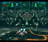 The first mode is an on rails shoot 'em up akin to Space Harrier, where it involves flying the Sub-light Strike Craft through space towards huge scaling sprites of a planet or space station and flying across a texture mapped planetscape, while shooting upcoming enemies from either the front or behind and collecting power-ups along the way.