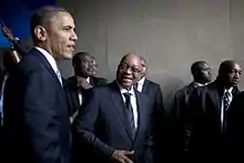 The election of Obama along with Mbeki's departure from office as well as the enactment of the African Growth and Opportunity Act (AGOA) with South Africa as a key beneficiary greatly improved opinions within the South African government of its relation with the United States. As of 2014 the relation between South Africa and the United States in the Zuma/Obama years is thought not to be as close as it was during the Mandela/Clinton years but greatly improved since the Mbeki/Bush years.[44] The Zuma years coincided with a continuation of cooling of South Africa–United States relations whilst China–South Africa relations warmed significantly[47] as South Africa focused diplomatic efforts supporting the BRICS initiative.