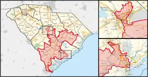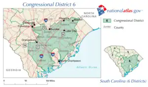 South Carolina's 6th congressional district is in central and eastern South Carolina. It includes all of Allendale, Bamberg, Calhoun, Clarendon, Hampton, and Williamsburg counties and parts of Charleston, Colleton, Dorchester, Florence, Jasper, Orangeburg, Richland and Sumter counties. With a Cook Partisan Voting Index rating of D+14, it is the only Democratic district in South Carolina.[2]