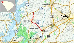 South Carolina Highway 137 (SC 137) is a 8.410-mile-long (13.535 km) state highway in the U.S. state of South Carolina. The highway connects Norris with rural areas of Pickens, via Six Mile.