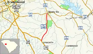 South Carolina Highway 248 (SC 248) is a 6.170-mile (9.930 km) primary state highway in the U.S. state of South Carolina. It serves as main access to the Ninety Six National Historic Site.