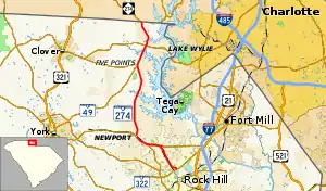 South Carolina Highway 274 (SC 274) is a 17.537-mile (28.223 km) primary state highway in the U.S. state of South Carolina. It connects the cities of Rock Hill and Gastonia, North Carolina. Though it travels generally in a north–south direction, it is signed west–east.