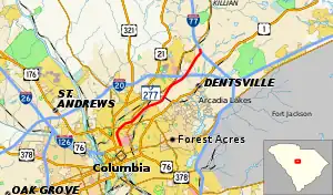 South Carolina Highway 277 (SC 277) is a 8.140-mile (13.100 km) state highway in the U.S. state of South Carolina. It travels from U.S. Route 76 (US 76) in downtown Columbia to Interstate 77 (I-77; at its exit 18) in Dentsville in Richland County.[2] For most of its length, it is a controlled-access highway conforming to interstate standards. The highway serves as a spur into Columbia from its northeastern suburbs and from intercity traffic traveling from I-77 and I-20. The freeway portion of SC 277 is called the Northeastern Freeway or I. DeQuincey Newman Freeway while the 0.7 miles (1.1 km) of surface street is part of Bull Street.