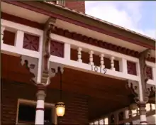 A brick Stick-Eastlake style house, this was built in 1886 for Alfred M. Potter, a prominent doctor and civic leader. The alley immediately north of the house is named for his wife, the former Lily M. Obenchain. Both the front and right side are sheltered by a Stick-style veranda, and the slate roof features details such as crests and a dentilled underside. During the 1970s, renovators found the Potters' signatures on the original walls.