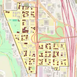 The 31-block area is irregular in shape, bounded by Southwest Barbur Boulevard to the west and Southwest Hood Street to the east. Southwest Meade and Arthur Streets define much of the northern boundary.[3]