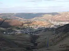 The South Wales Valleys hosted Britain's only mountainous coalfields.[2] Topography defined the shape of the mining communities, with a "hand and fingers" pattern of urban development.[3] There were fewer than 1,000 people in the Rhondda valley in 1851, 17,000 by 1870, 114,000 by 1901 and 153,000 by 1911; but the wider impact of urbanisation was constrained by geography—the Rhondda remained a collection of villages rather than a town.[4] The population of the Valleys in the late 19th and early 20th centuries was disproportionately young and male; many of them were migrants drawn from other parts of Wales or from further afield.[4] The new communities had extremely high birth rates—in 1840, more than 20 per cent of Tredegar's population was aged under seven, and Rhondda's birth rate in 1911 was 36 per thousand, levels usually associated with mid-19th century Britain.[4]