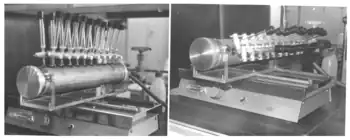 The split and pool synthesis was first applied to prepare peptide libraries on solid support. The synthesis was realized in a home-made manual device shown in the figure. The device has a tube with 20 holes to which reaction vessels could be attached. One end of the tube is linked to a waste container and a water pump. Left shows loading and filtering, right coupling-shaking position. In the early years of combinatorial chemistry, an automatic machine was constructed and commercialized at AdvancedChemTech (Louisville KY USA). All operations of the S&P synthesis are carried automatically under computer control. At present, the Titan 357 automatic synthesizer is available at aapptec (Louisville KY, USA).[6]