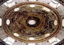 This program continues in the interior as well, above all in the dome fresco by Johann Michael Rottmayr of Salzburg and Gaetano Fanti, which displays an intercession of Charles Borromeo, supported by the Virgin Mary. Surrounding this scene are the cardinal virtues. The frescos in a number of side chapels are attributed to Daniel Gran.