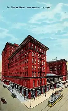 The St. Charles Hotel was a hotel on St. Charles Avenue in New Orleans, Louisiana, situated across the street from the St. Charles Museum.[1] One of the first of the great hotels of the United States, the original Grecian palace-style building, opened in 1837, has been described by author Richard Campanella as "one of the most splendid structures in the nation and a landmark of the New Orleans skyline".[2] It was some time before it found a rival in the Astor House, of New York City. It was said that the hotel's Parlor P had probably witnessed more important political events than any room or any building in the country, outside of the Capitol at Washington, D.C.[3] During the Civil War, Union General Benjamin Butler seized the hotel to use for his headquarters after the city surrendered. The third incarnation of the hotel was finally demolished in 1974.